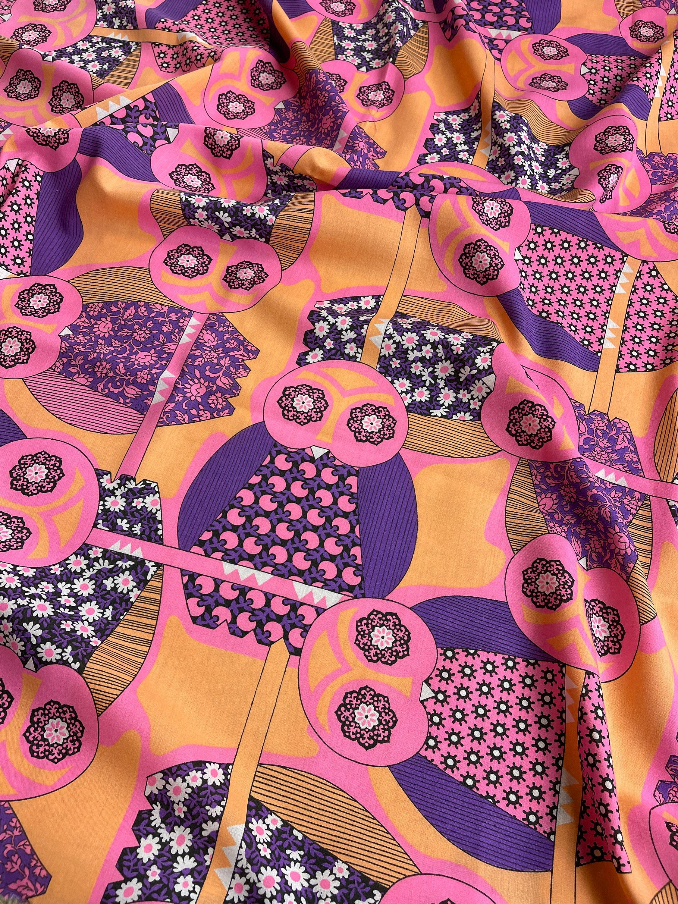 A beautiful neon, lightweight cotton poly blend featuring the cutest owls. The colors are bright and vibrant but also kind of a pastel – I am calling it “neon cantaloupe π The large print is bold and the 1 1/2 yard piece is perfect for a vintage inspired top, mini skirt, a bag or even a throw pillow or two!
