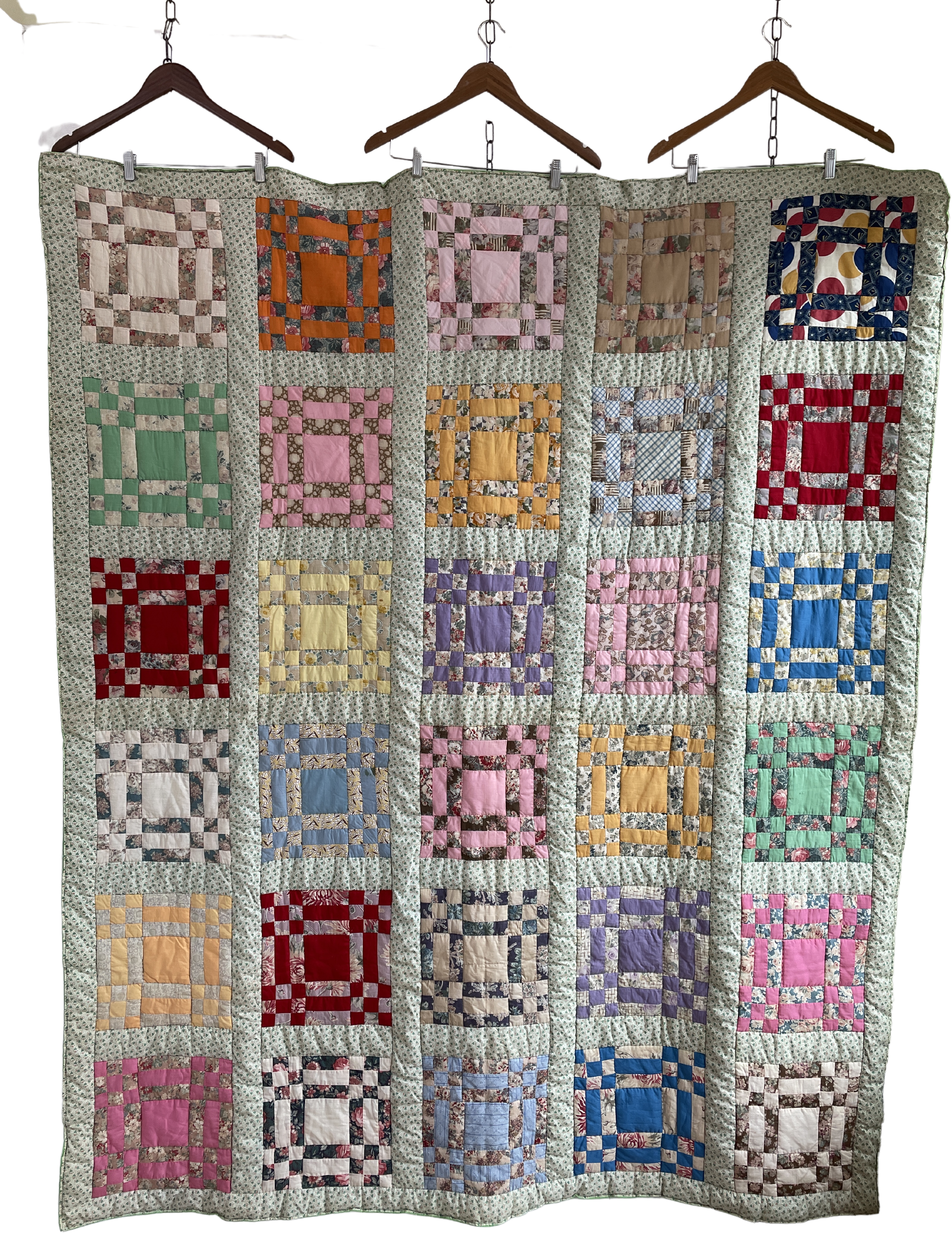 Incredible, vibrant 1910s/1920s quilt in a nine patch and rails variation. A beautiful collection of floral print curtaining and dress materials with vibrant solids. This quilt top was assembled and set aside for decades (it shows very little wear) and finished at a much later date. The backing fabric, and likely the batting are much more modern. I can tell from the feel that the backing is a poly/cotton blend and does not have the same feel as the antique fabrics. It was nicely hand quilted, except the outer edge which was finished with a machine zigzag stitch. There is one small stain and tear on the blue/cream block (see pictures).
