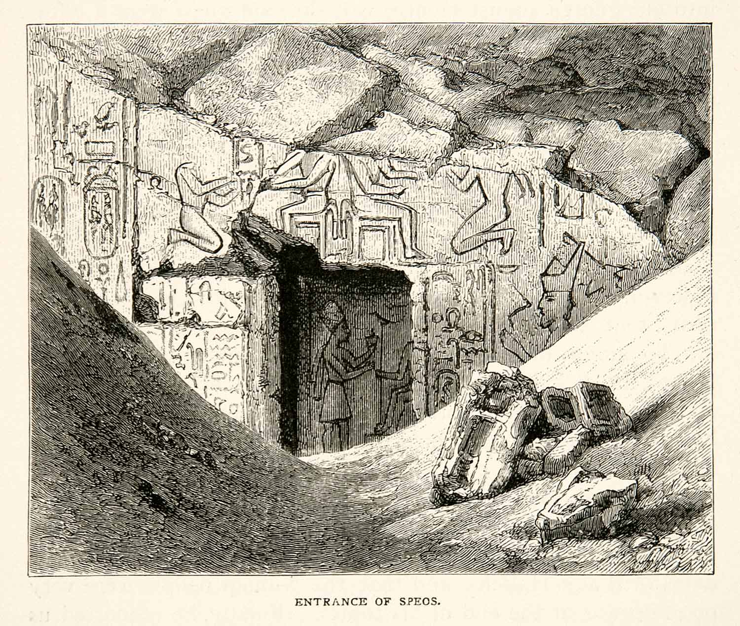 This is an original 1891 black and white in-text wood engraving of the entrance of Speos Artemidos in Egypt.