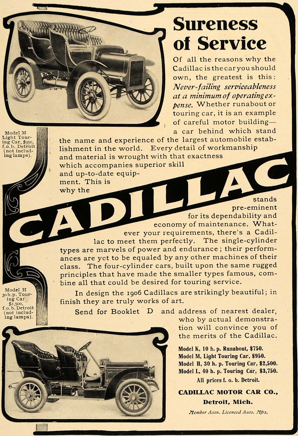 This is an original 1906 black and white print ad for models M and H Cadillac Touring Cars by Cadillac Motor Car Company located in Detroit, Michigan.