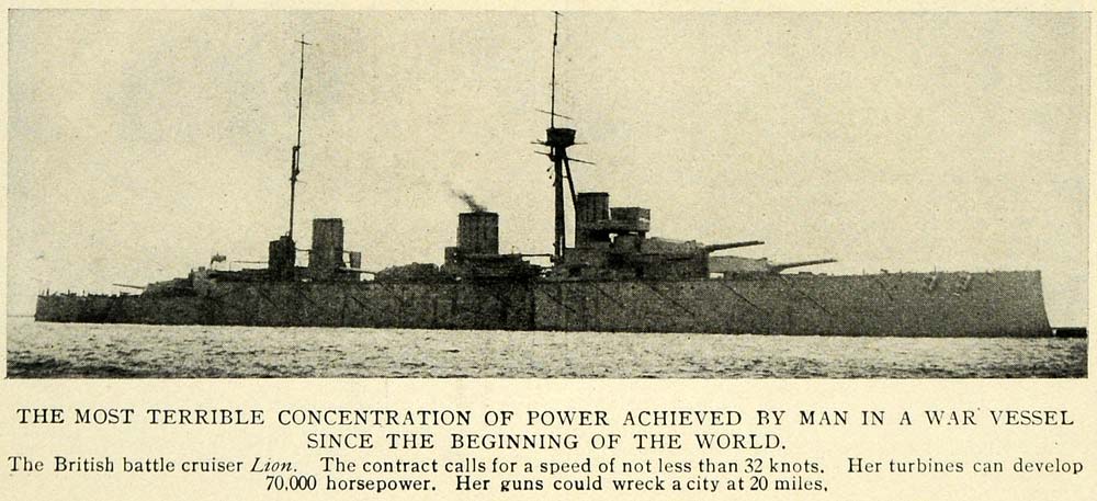 This is an original 1912 halftone print of the British battle cruiser, Lion. The caption writes, “The most terrible concentration of power achieved by man in a war vessel since the beginning of the world.”