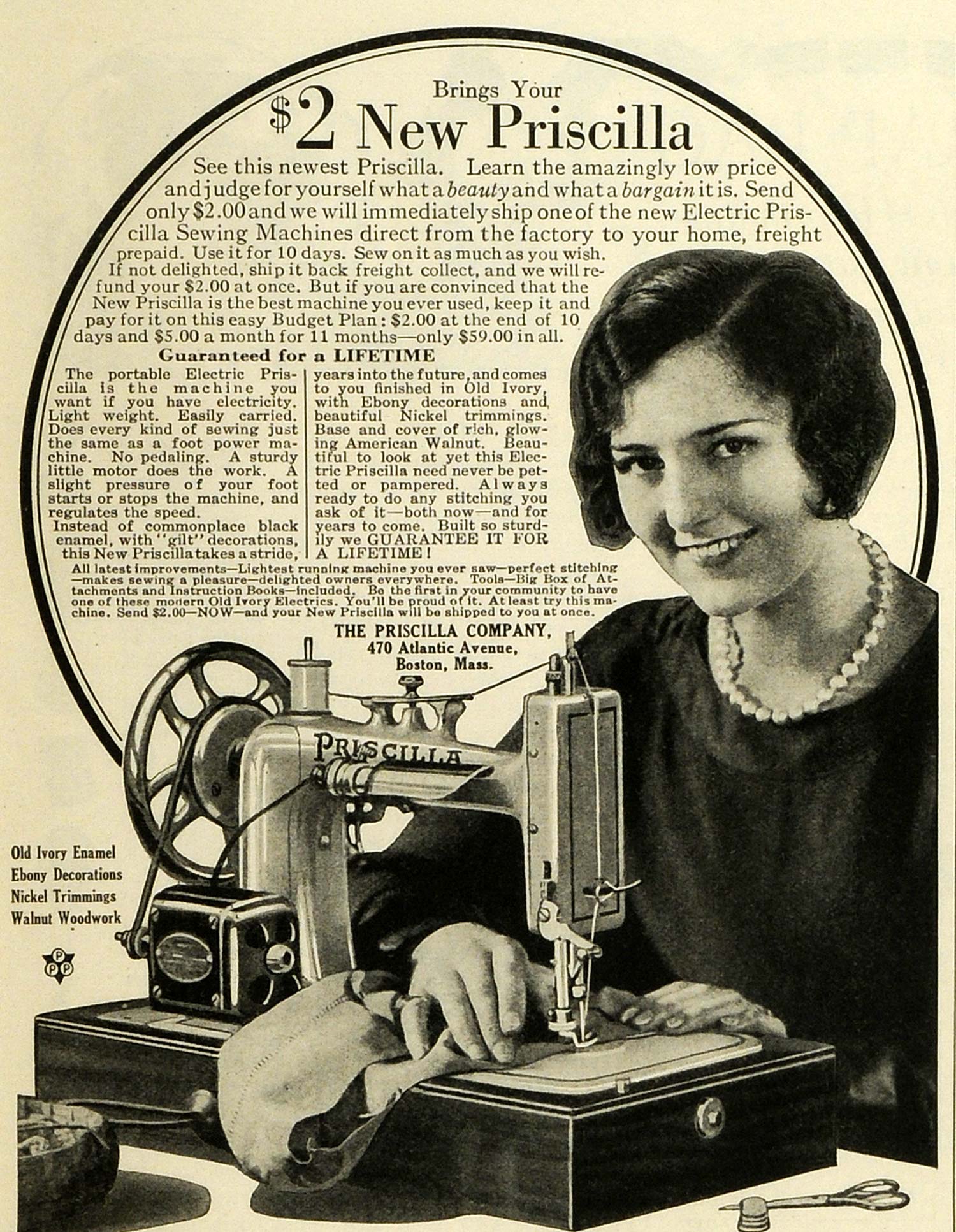 This is an original 1928 black and white print ad for the Electric Priscilla Sewing Machines from Priscilla Company located at 470 Atlantic Avenue, Boston, Massachusetts.
