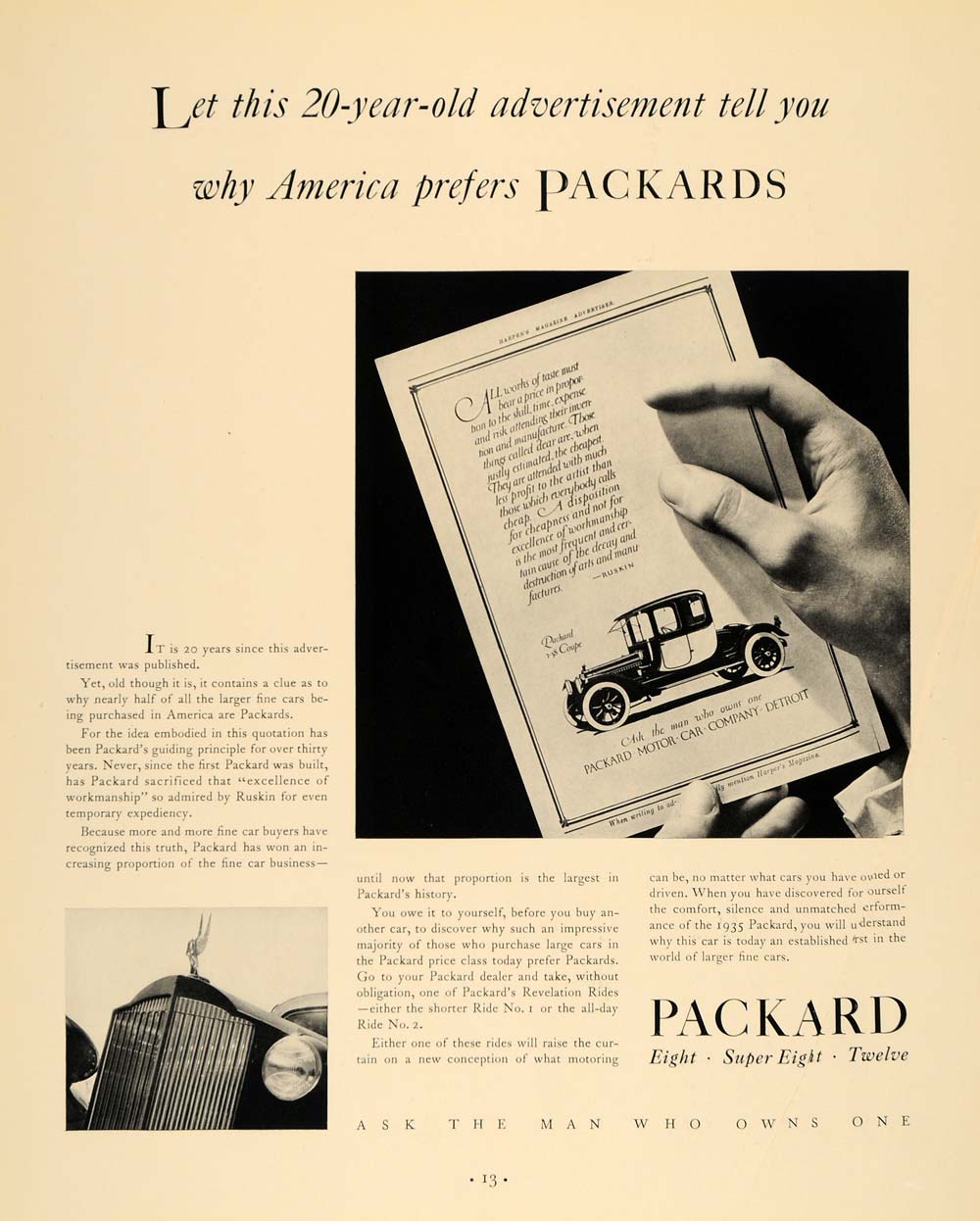 This is an original 1935 black and white print ad for Packard Eight, Super Eight and Twelve models, specially featuring an antique Packard 2-38 Coupe.