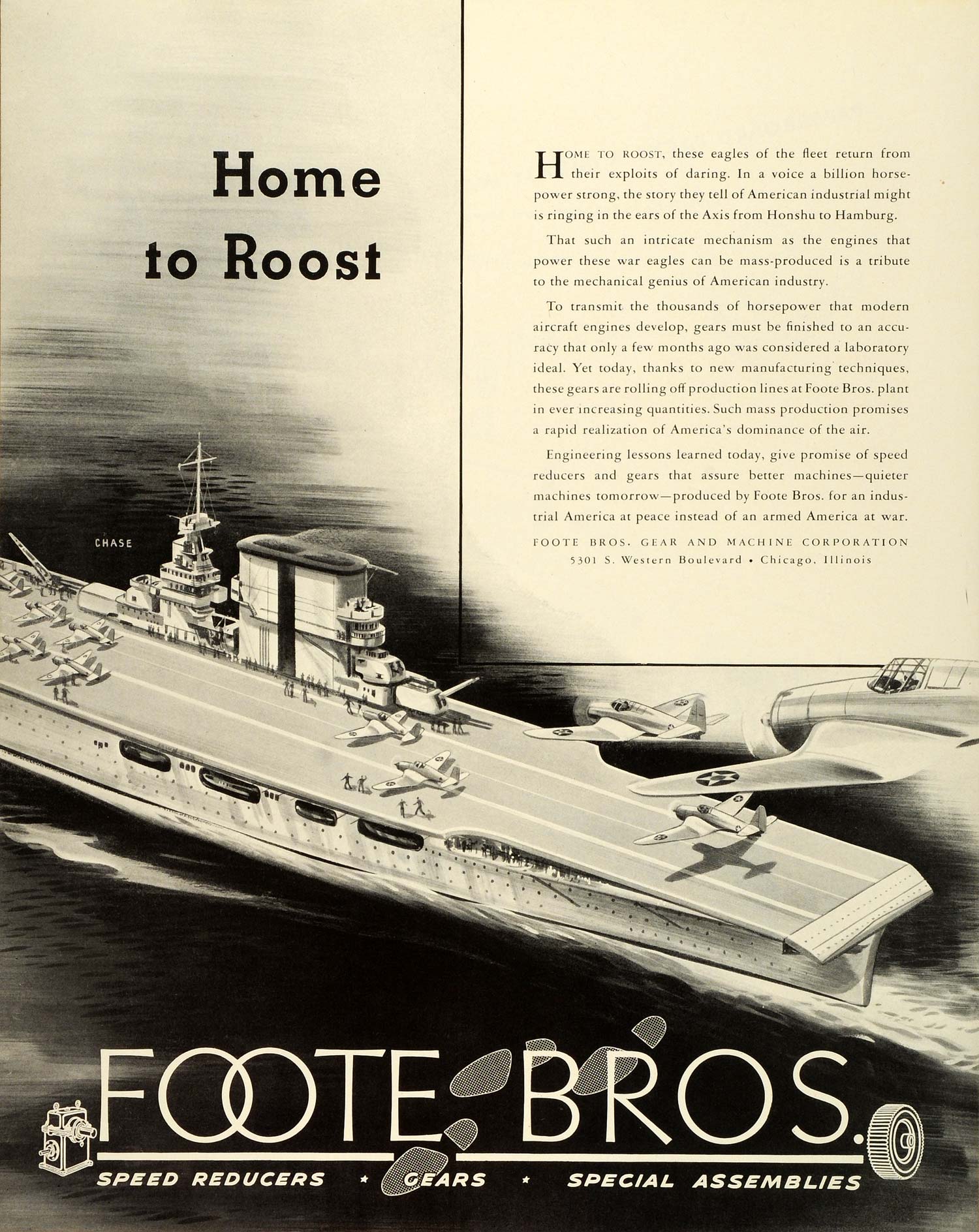 This is an original 1942 black and white print ad for the Foote Brothers Gear and Machine Corporation of 5301 S. Western Boulevard in Chicago, Illinois. This ad features their speed reducers, gears, and special assemblies for the marine fleets of the United States armed forces during World War II.