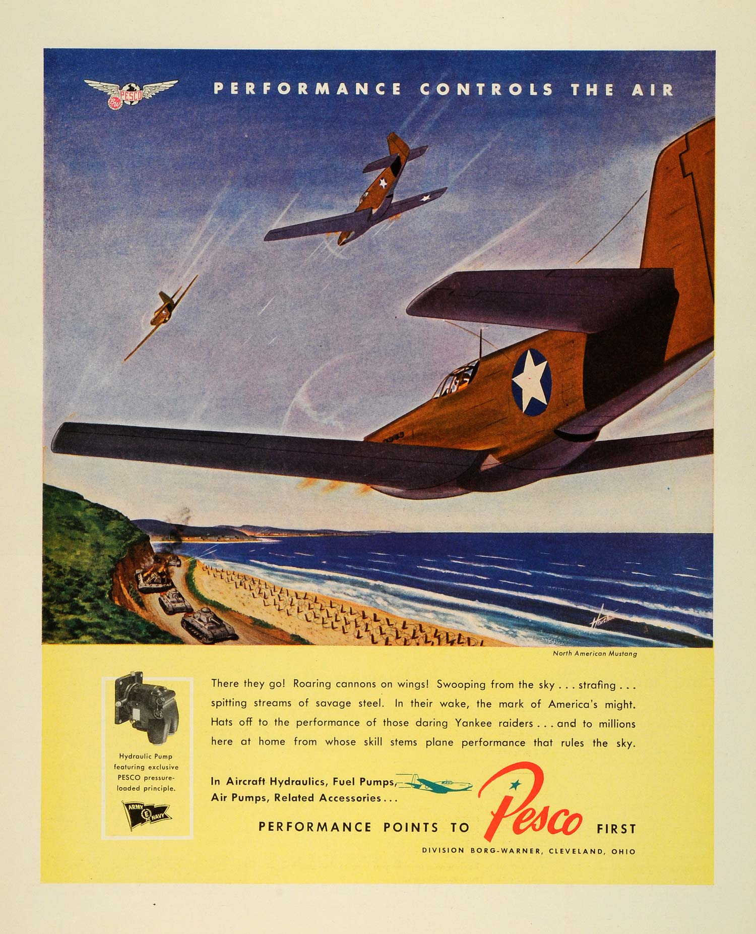 This is an original 1943 World War II color print ad for Pesco aircraft parts, a navsion of Borg-Warner of Cleveland, Ohio, who are doing their part to aid in the war production efforts by manufacturing a surplus of their aviation supplies for use by the U. S. military.