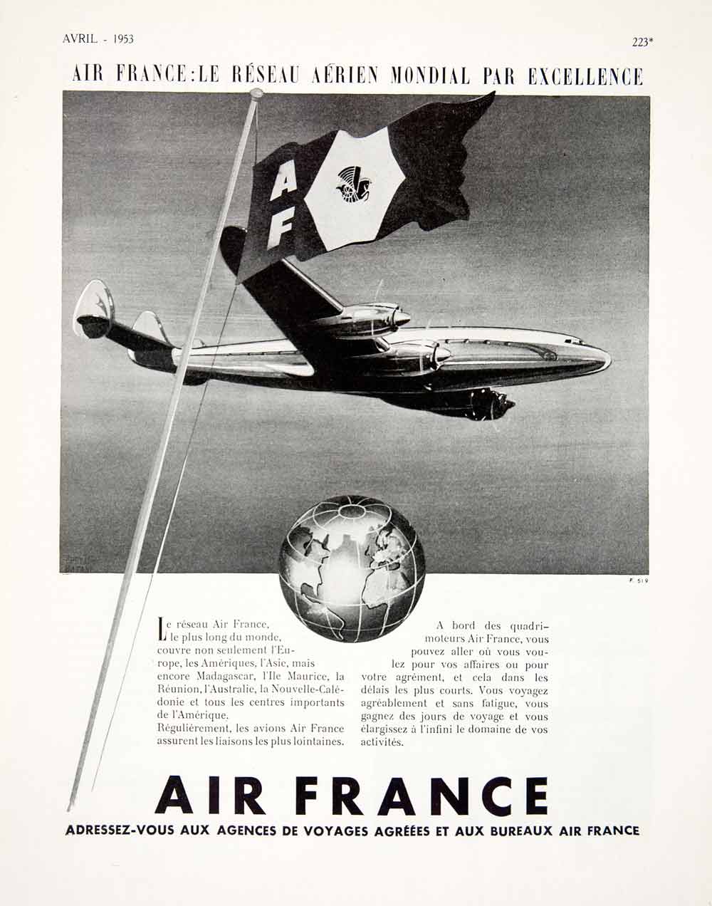 This is an original 1953 black and white print ad for Air France.