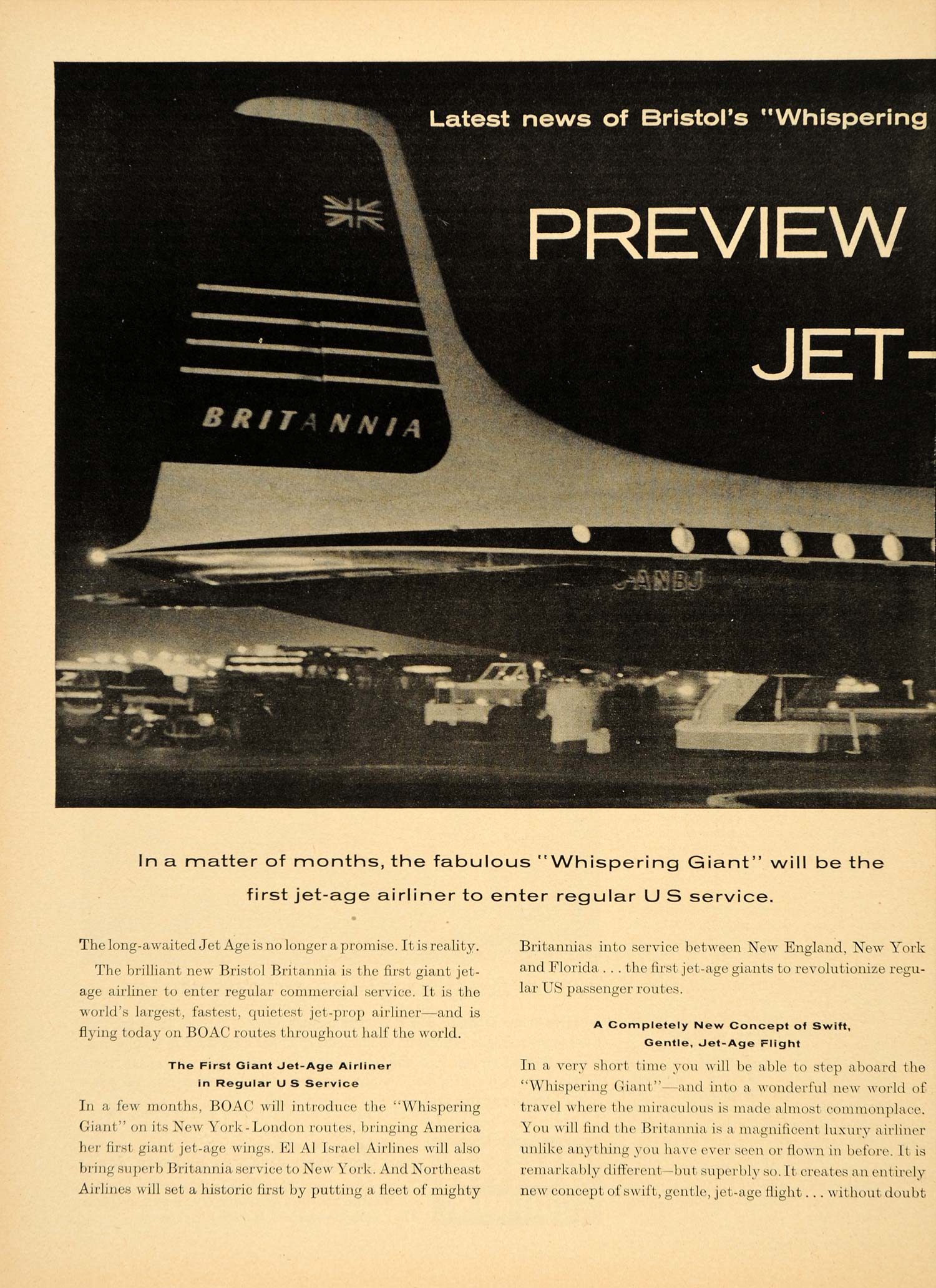 This is an original 1957 black and white two-page print ad promoting the Whispering Giant, the world’s largest passenger airliner from Bristol Aircraft Limited.