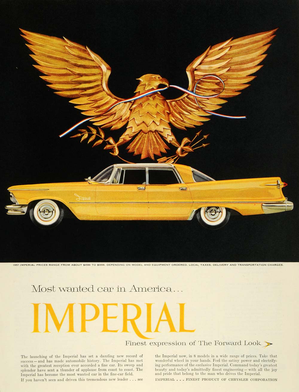 This is an original 1957 color print ad for the Imperial by Chrysler, “most wanted car in America.”