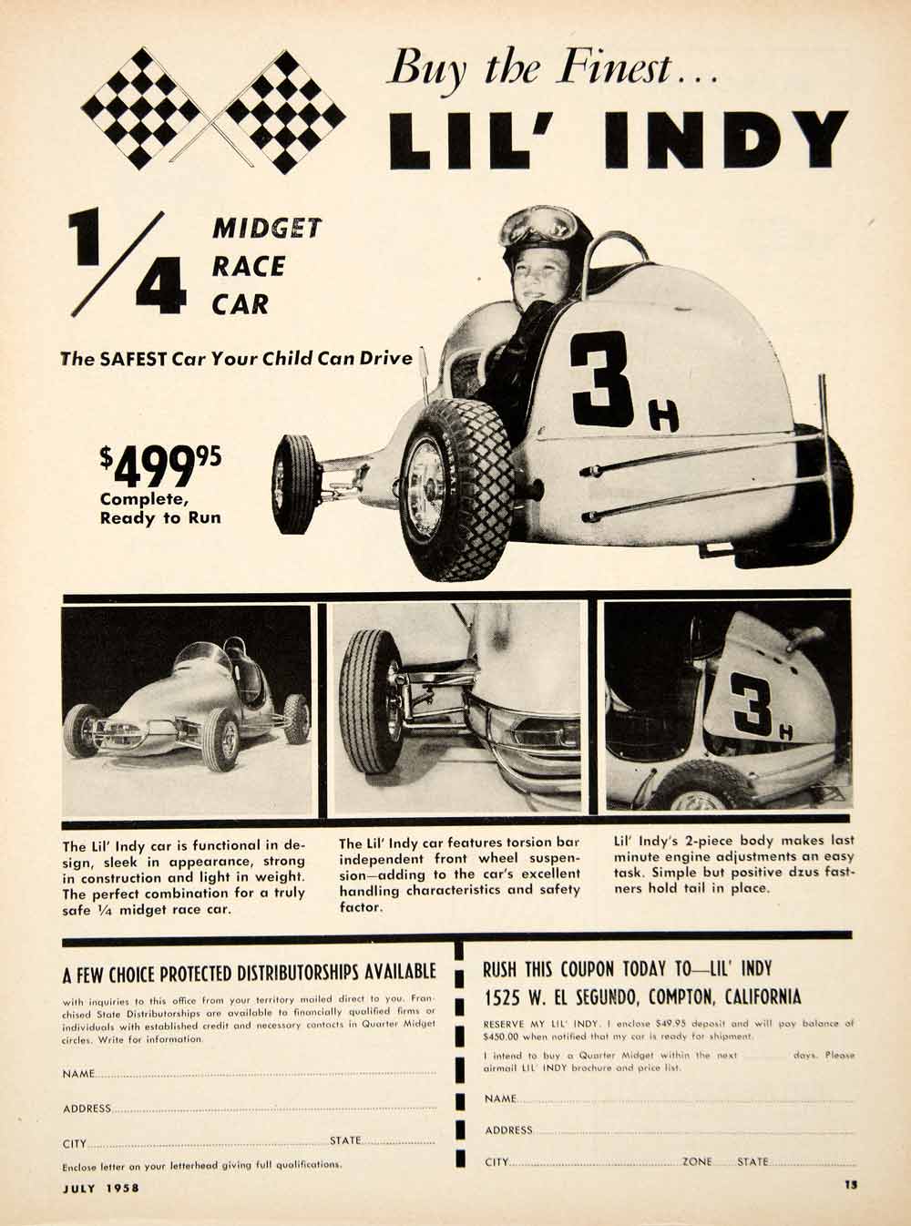 This is an original 1958 black and white print ad for the Lil’Indy child’s race car. Correspondence could be send to: 1525 West El Segundo, Compton, California.