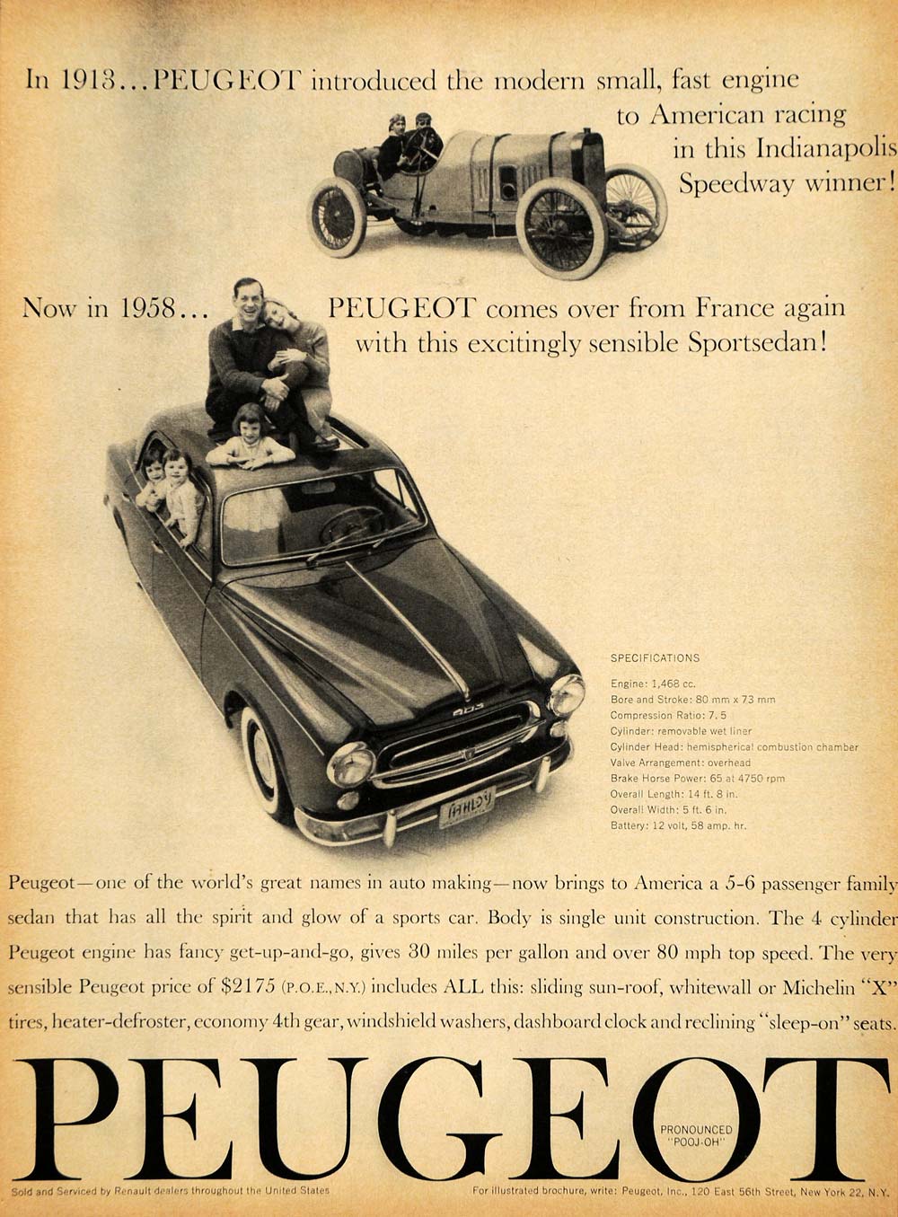 This is an original 1958 black and white print ad for the Peugeot Sportsedan.