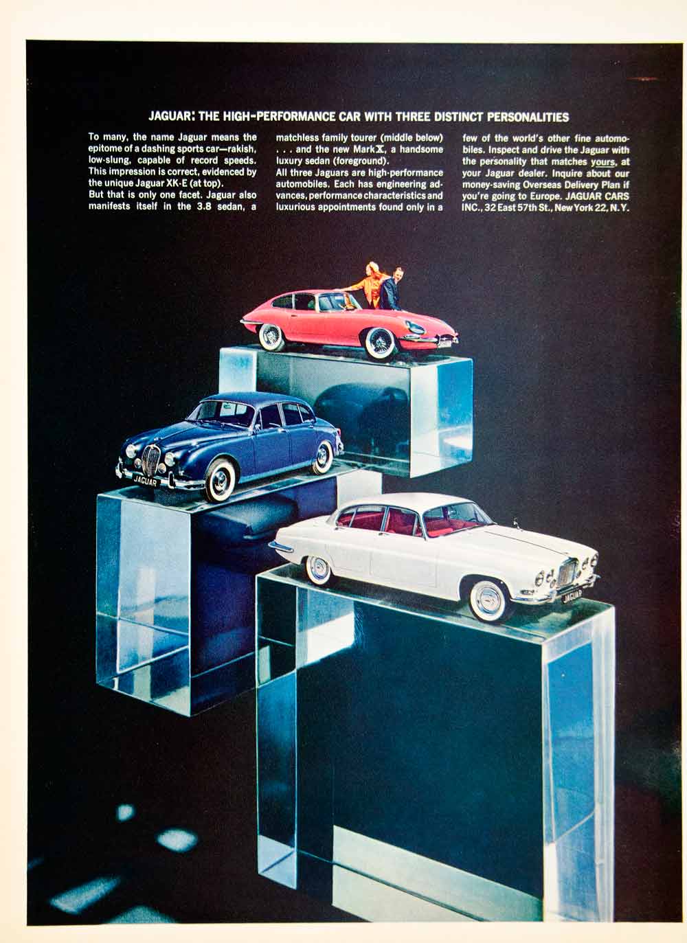 This is an original 1963 color print ad for Jaguar high-performance cars: the Jaguar XK-E in red; the 3.8 Sedan in blue; and the Mark X in white.