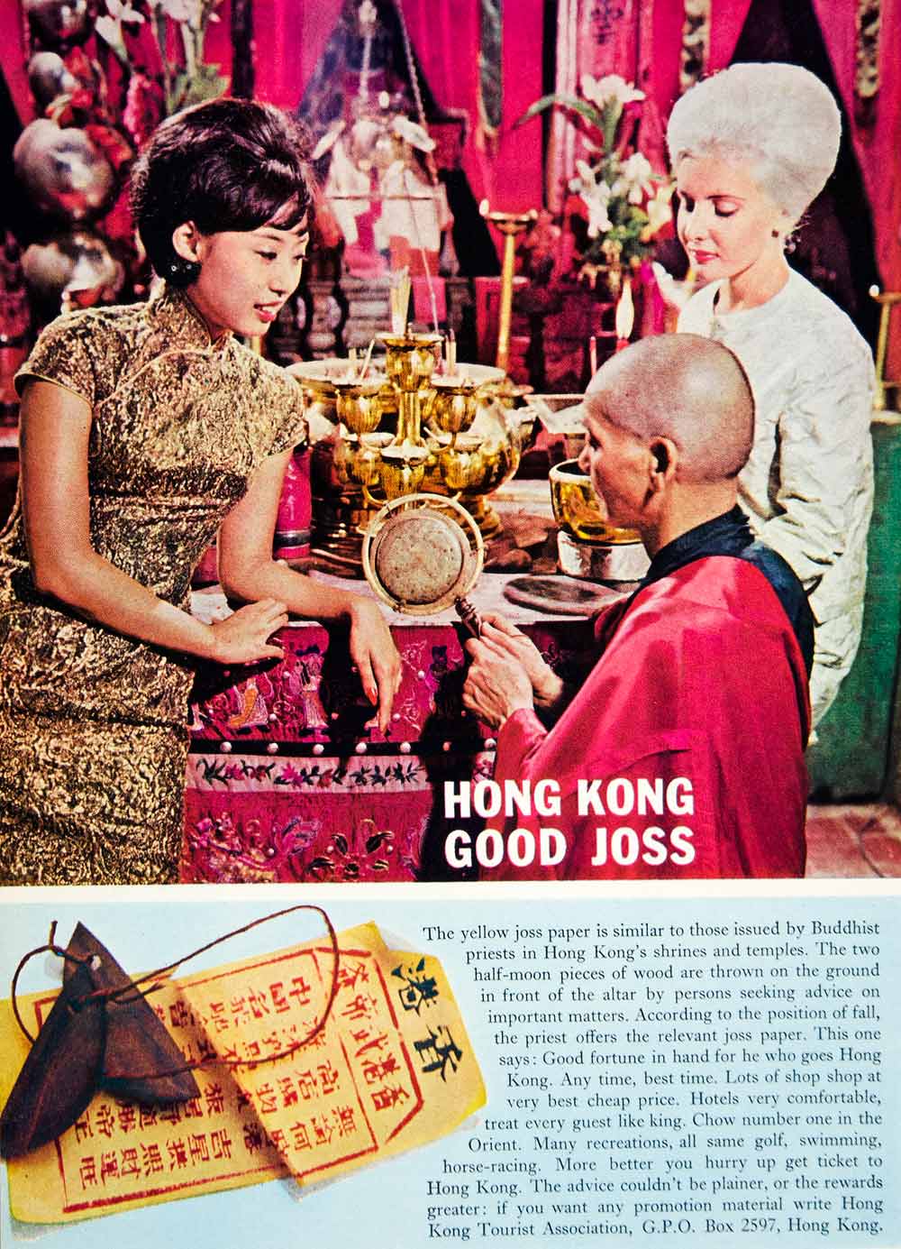 This is an original 1963 color print ad promoting tourist travel to Hong Kong from the Hong Kong Tourist Association.
