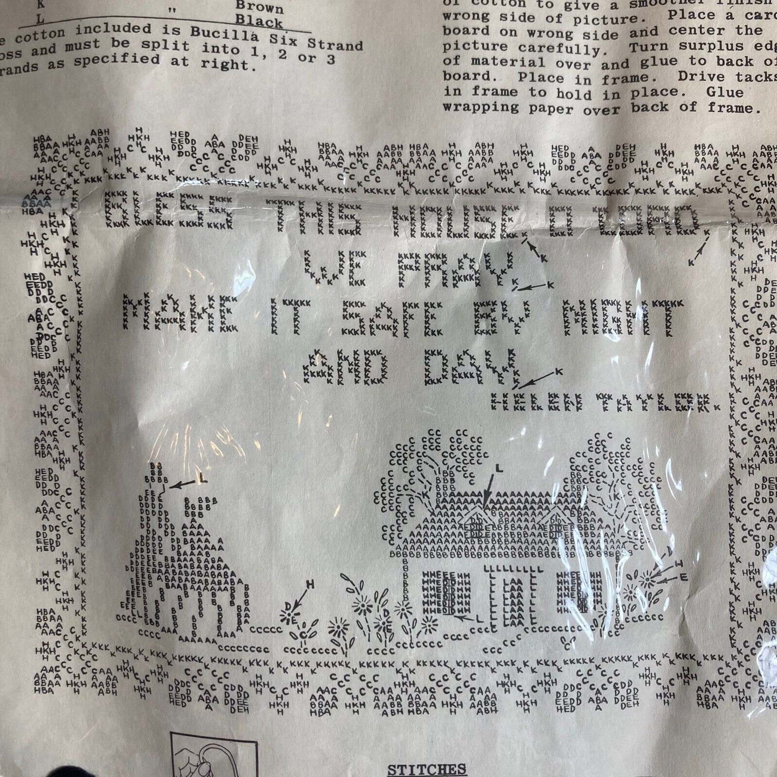 Reads “Bless This House O Lord, We Pray, Make it Safe by Night and Day, Helen Taylor.” Includes stamped linen and 6-strand cotton floss.