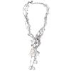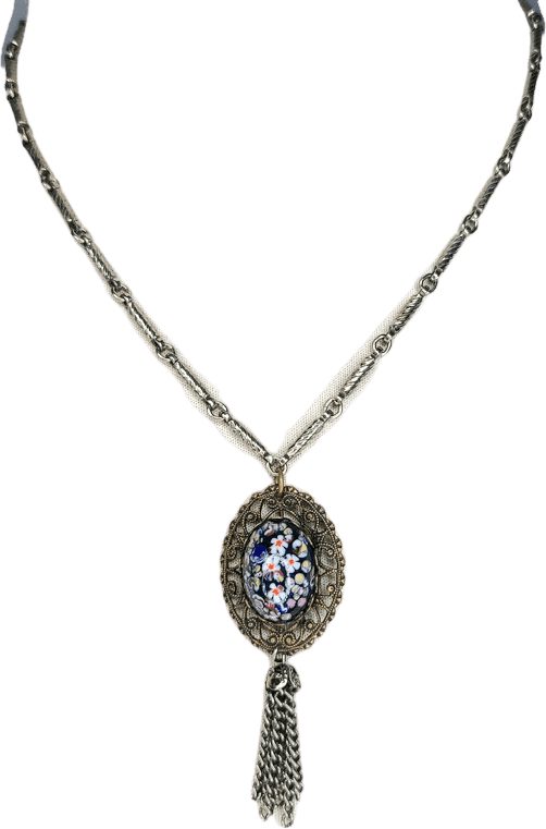 Vintage Edwardian style necklace. Age unknown, but estimated to be 1940s. Blue handpainted cabochon with flower design, in filigree setting with silver chain tassels. Link chain with oval chain at back. J hook closure.