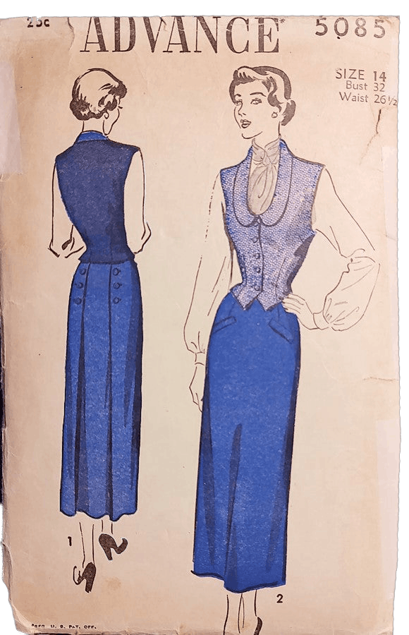 An early 1950s original vintage sewing pattern for a stylish fitted vest or weskit and longer length skirt by Advance. #5085.
