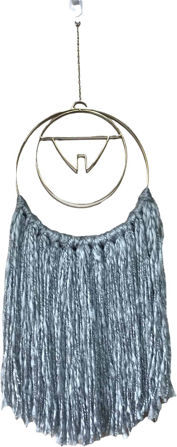 This gorgeous vintage 1960s to 1970s home decor wall hanging features a brassy golden circle with geometric patterns on the inside, a hanging chain, and hand knotted gray chunky yarn like a Dreamcatcher. Excellent condition and extremely unique.