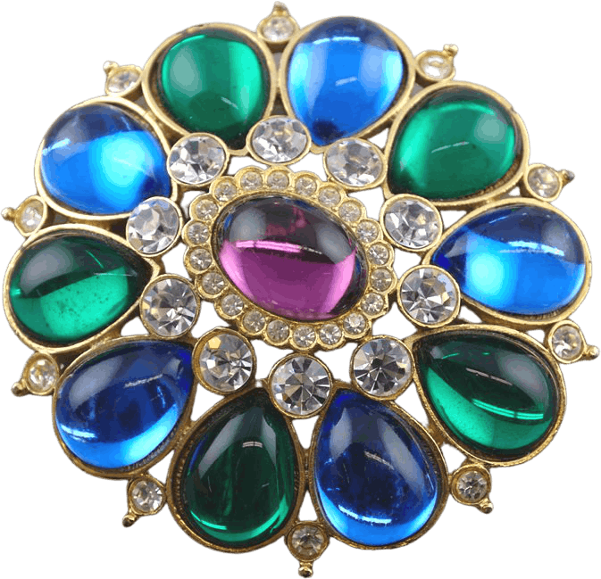 This large Butler and Wilson vintage brooch from the 1980s pairs jewel toned cabochon stones with clear rhinestones–a great example of their bold, unapologetically costume and bling-y designs from that era. The foiled glass teardrop-shaped cab stones are set in frosted gold, open-back settings, accented by the smaller, sparkling rhinestones. The back of the pin is stamped B&W. Probably designed as that 80s classic, a lapel pin for your favorite shoulder-padded jacket or coat, this heavy-weight brooch is in excellent condition.