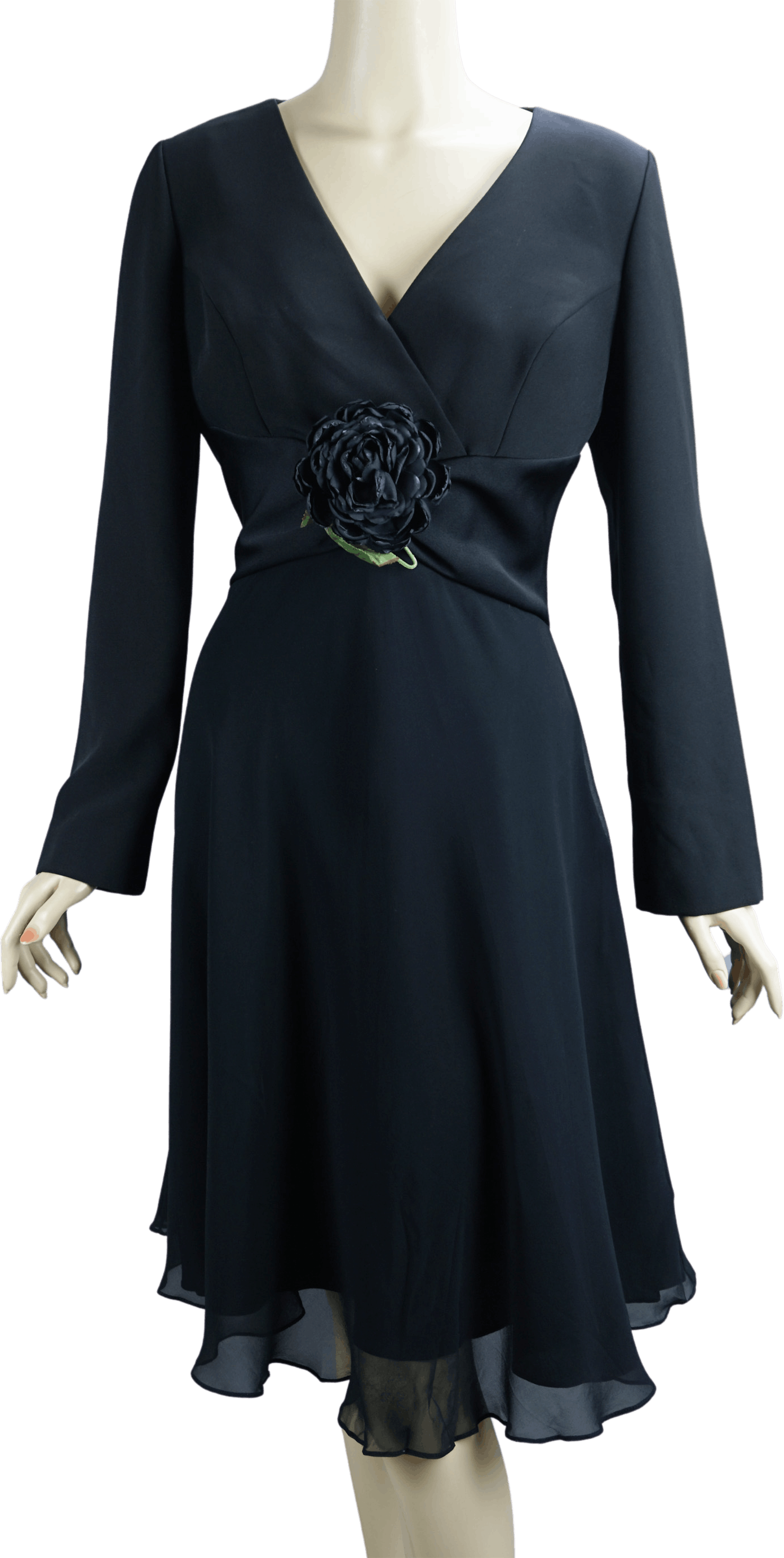 Black crepe formal dress. Faux wrap bodice with long sleeves, wide waist with side zipper. Skirt is an acetate lining with a silk chiffon overlay. Front holds a large black silk rose.