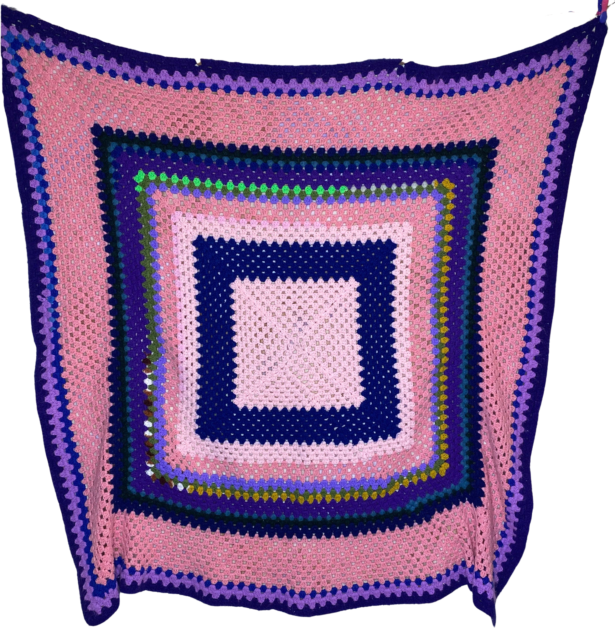 Acrylic Crochet Afghan In Pink Blue and Black Concentric Squares Newest For Sale