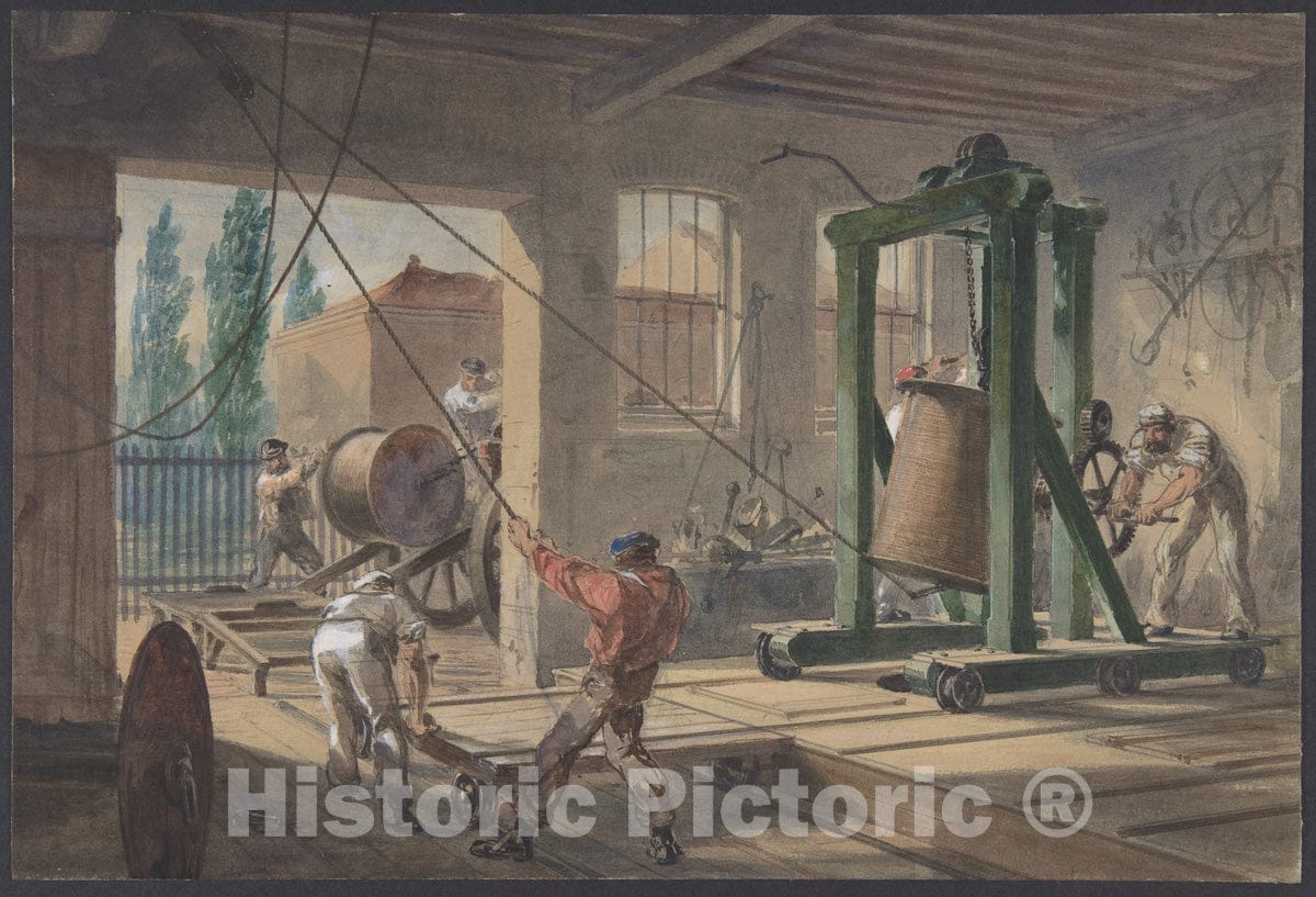 The Reels of Gutta-percha Covered Conducting Wire Conveyed into Tanks at the Works of the Telegraph Construction and Maintenance Company, at Greenwich – British, 1826–1909 – Artist Nationality: British – Original Medium, Materials or Technique: Watercolor over graphite with touches of gouache