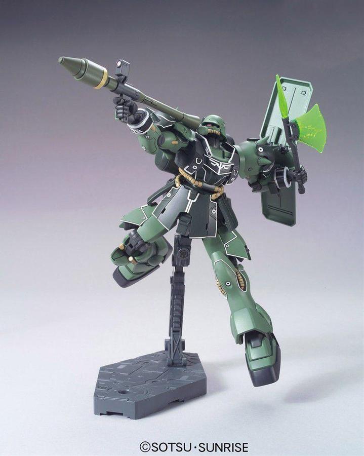 The Geara Zulu Guards Type features additional armor on its shoulder paldrons and a Geara Doga shield. Comes with a large number of weapons including beam machine gun,with grenade launcher, hand grenades, sturmfaust, beam pike, and additional ammo clips.