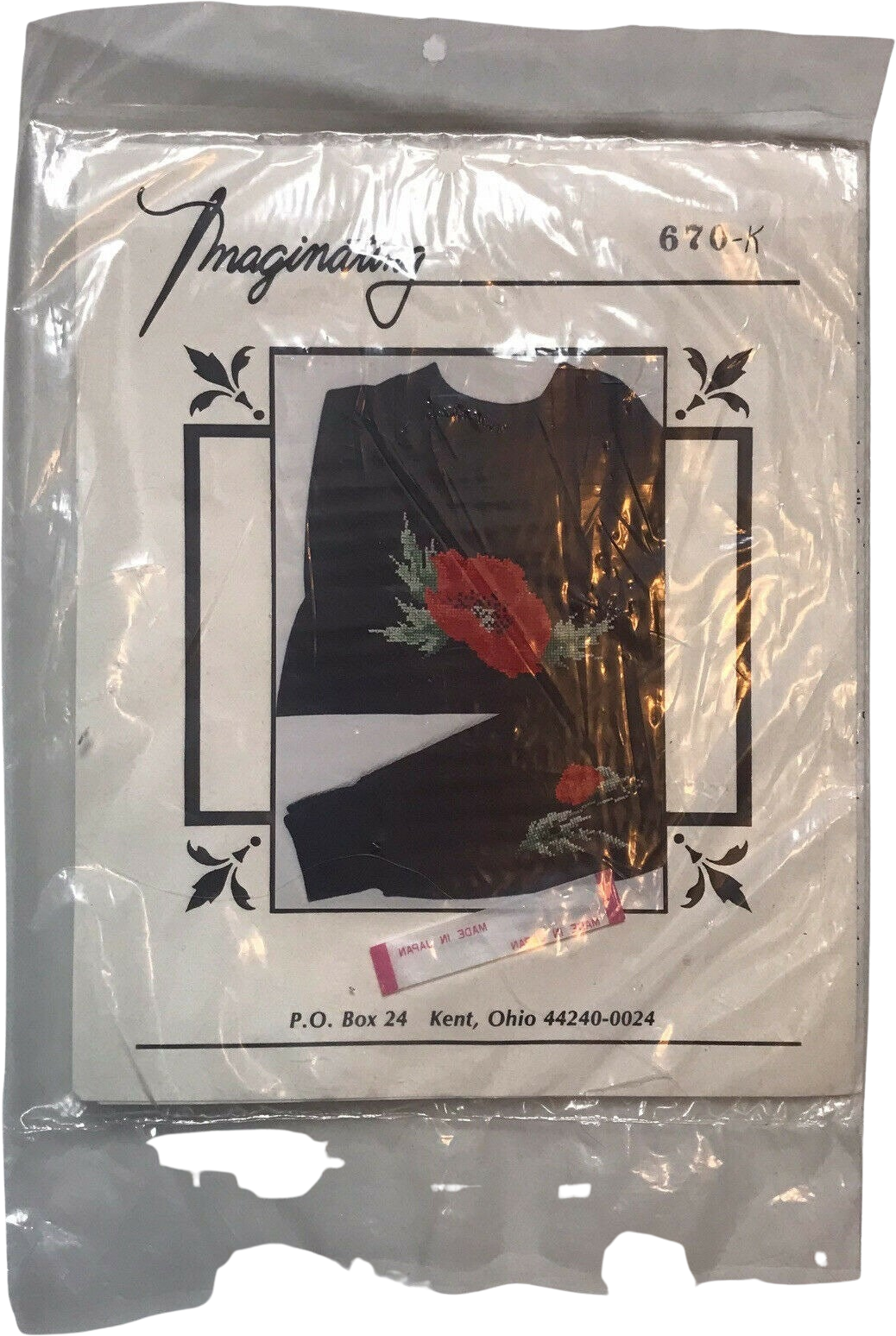 This kit is sealed, and has no information on the package, but I was able to peek inside somewhat and can see that the kit is designed by Beth Grubb of Dew Drop Designs. I believe fabric is tear-away so you create this to go on top like shown in the photo, but I imagine you could also use it on a tote bag, pillow cover, or any other fabric project.