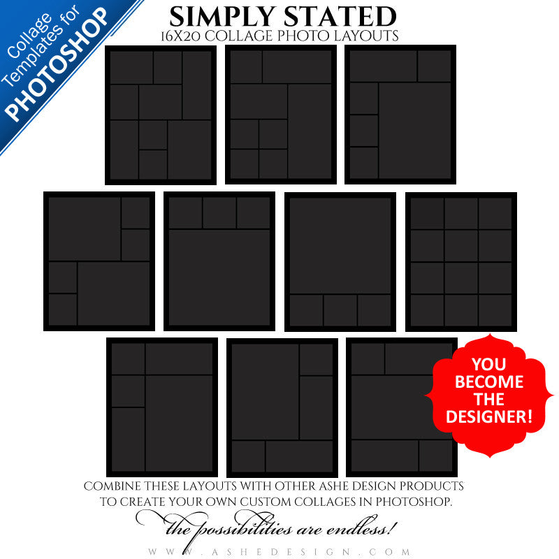 Get our Photoshop Collage Layout templates and start designing custom photo collages. Pair them with our Word Art, Designer Gems, Designer Digital Papers and Collage Accessory Kits (sold separately) to design beautiful custom collages in a snap! Combine these Layouts with other Ashe Design products to create your own custom collages in PHOTOSHOP.