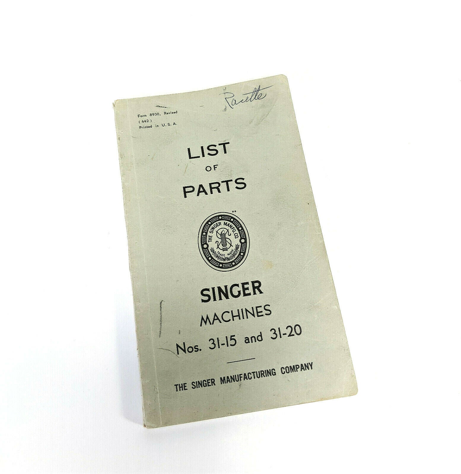 Original list of parts booklet for the Singer 31-15 and 31-20 industrial sewing machine. Form 8930, Rev 442. Last copyright 1945. Contains a list of parts and illustrated plates. Remains in good vintage condition with typical signs of use, all pages are present & secure.