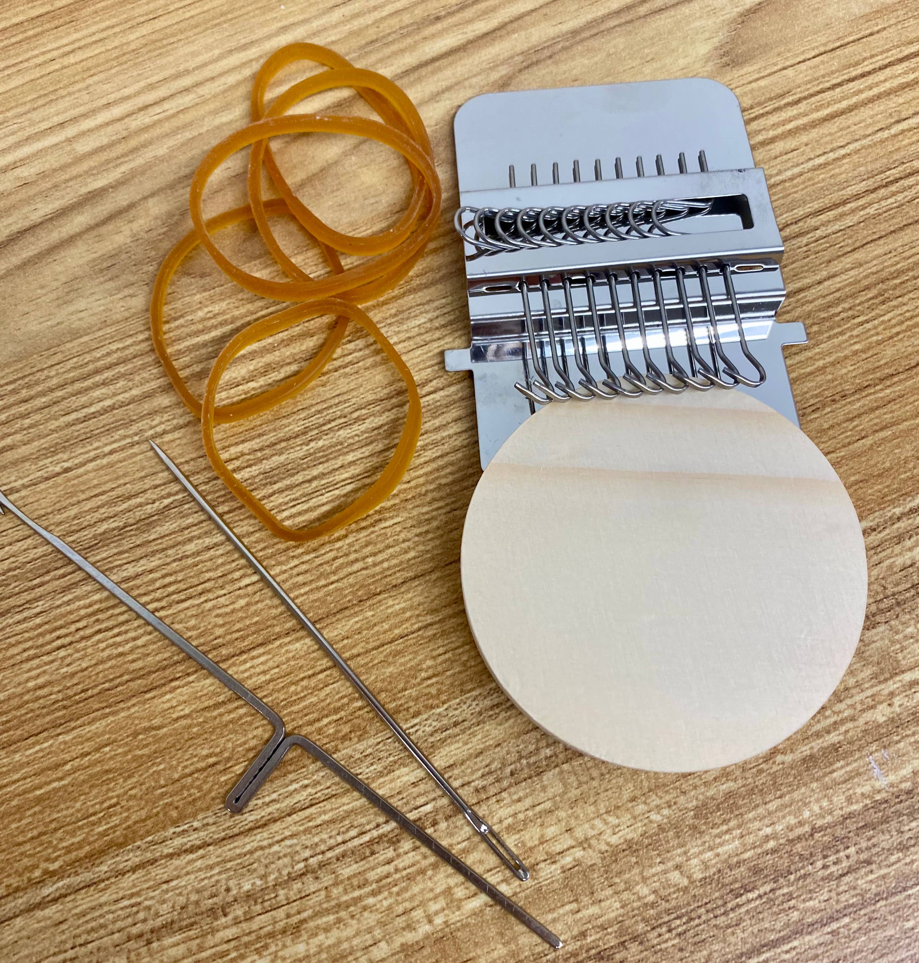 This reproduction of the classis Speedweve Loom is perfect for visible mending or repairing holes in socks, sweaters, and other items of clothing. This small loom contains 10 pins, which can be flipped back and forth to lift the warped threads for easy weaving.Each kit comes with the steel loom, a grooved wooden disc, a long darning needle, a crochet tool, five heavy duty rubber bands, and an instructional sheet.