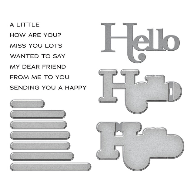 A Little Hello Sentiments Clear Stamp and Die Set is from the Spotlight Frames and Floral Collection by Lisa Horton. The stamp impresses a stack of four sentiments from how are you, miss you, dear friend and many more centered around the word, Hello. The stamps work with acrylic block and is made in the U.S.A. The large die is designed to cut all the sentiments at once into sentiment strips. The other three dies are designed to create a three-layered Hello for a bold design.