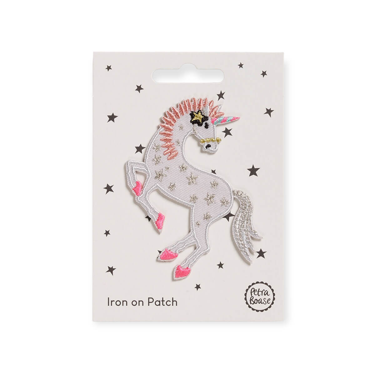 Unicorn stars iron on patch by Petra Boase. Richly embroidered colourful patch, with an iron-on backing so can be removed from the card and ironed on to a favourite t-shirt, rucksack or whatever you like!
