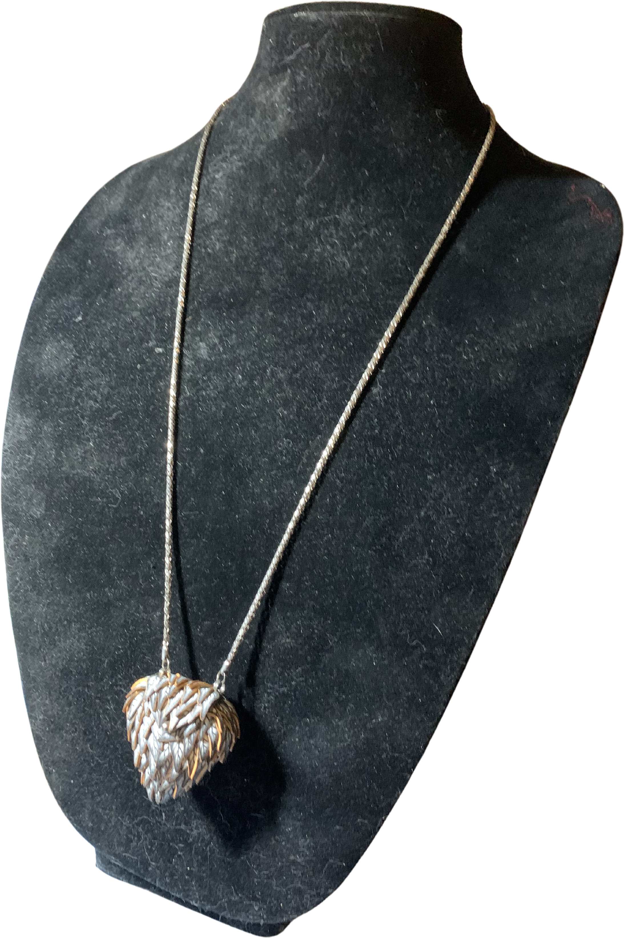 Very interesting round silver chain with a pendant/container at the bottom. The pendant is covered in polymer acrylic clay leaves, the entire thing seeming to be covering a sterling filigree interior. The chain is not sterling. However, the interior of the pendant is, and the necklace is 29 inches without the pendant, 32 inches with it.