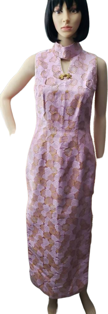 Stunning brocade dress done in a pretty pink and gold rose pattern. Dress has a mandarine collar, key hole chest and fantastic side slits. Zips at back with three hook and eye clasps at the collar.