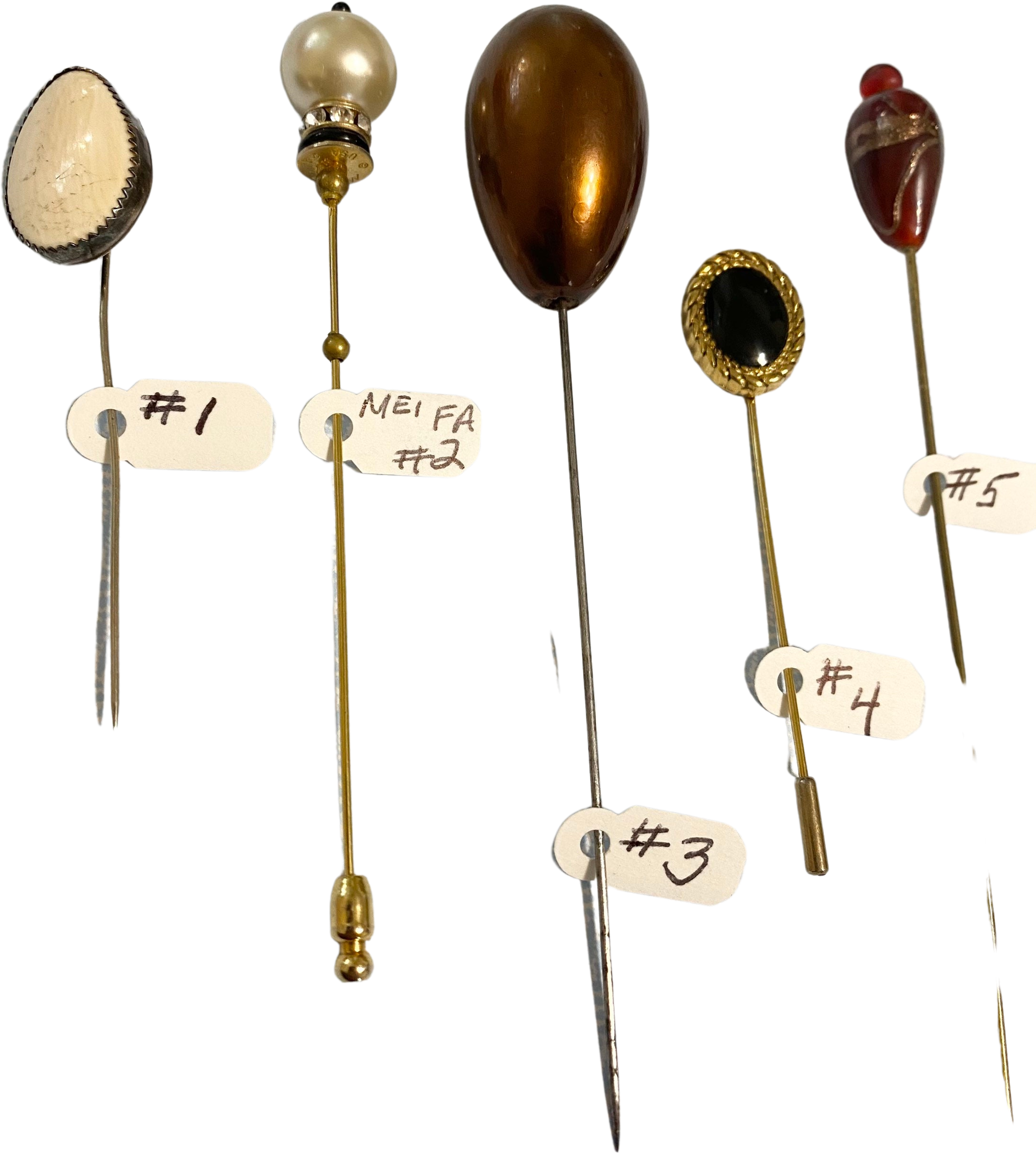 Innavidually priced and numbered stick/hat pins. They are beautiful estate pins. If you have questions or extra pictures please email me. Each number corresponds with the pin. Need cleaning/restoring. They are in their used vintage condition. See Pictures.